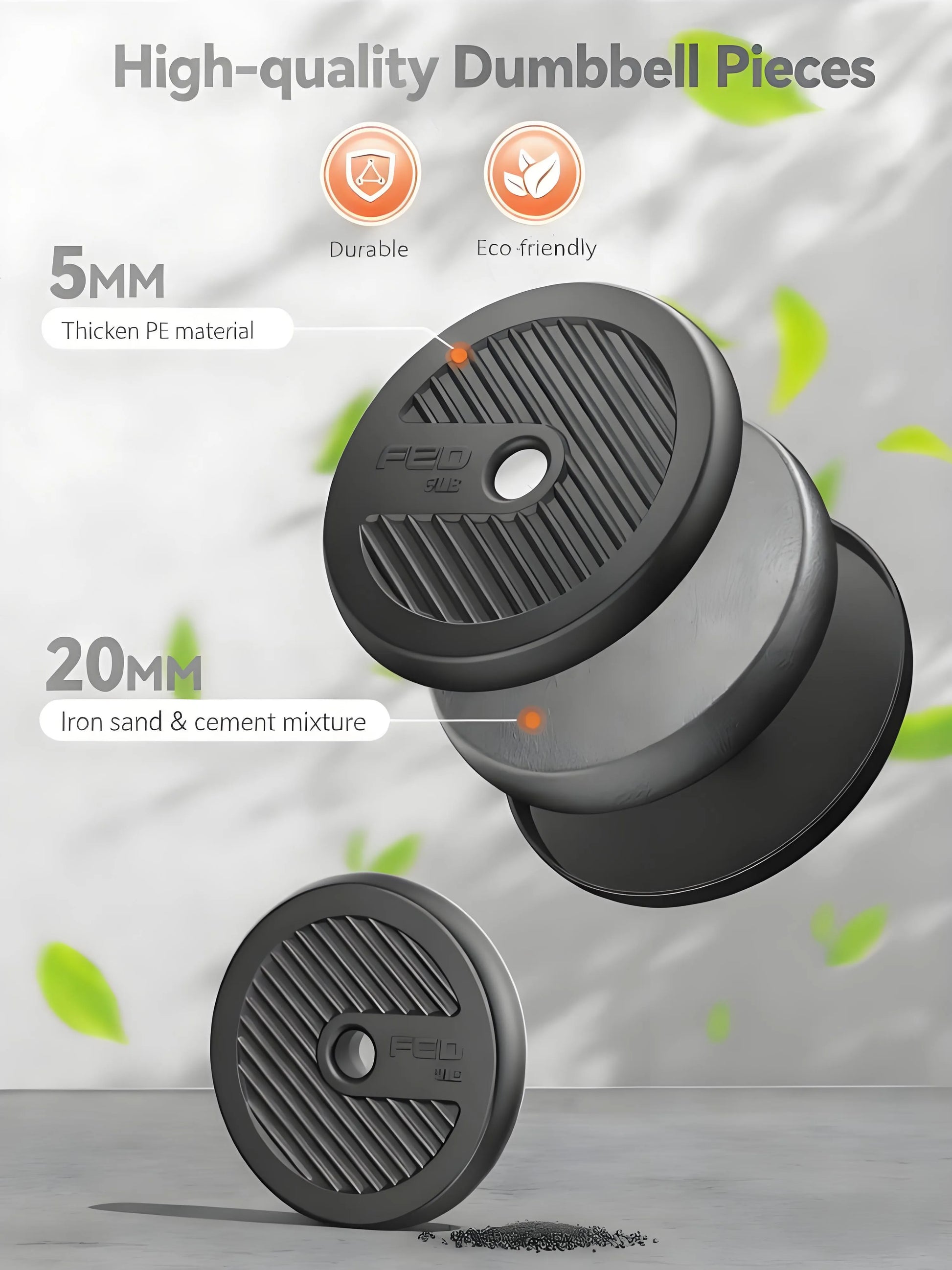 【Durable & Eco-Friendly Material, Balancing Practicality and Protection】 The dumbbell weight plates are made of high-quality PE eco-friendly shell, filled with a mixture of iron, mud and sand inside. It is not only strong and durable, not easy to deform after long-term use, but also can effectively reduce friction and impact on the floor, avoiding scratches or damage to the floor, making it more at ease for home use.