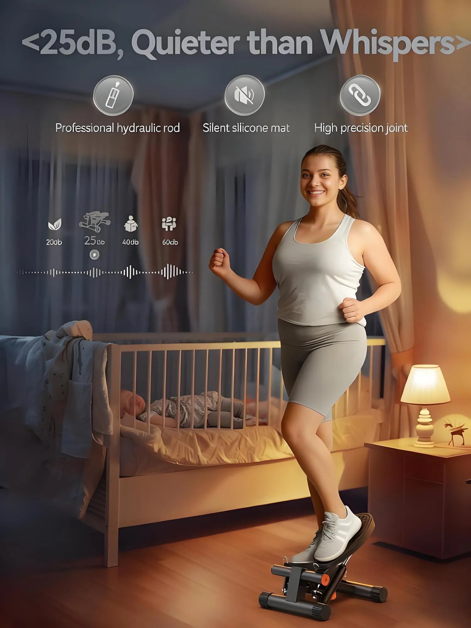 【Ultra-Quiet Operation, Worry-Free at Home】The stepper is equipped with silent silicone cushioning pads at the bottom, which form effective cushioning when stepping. The movement noise is only 25 decibels, much lower than the volume of daily conversation. Even when used at home, you don't have to worry about waking up sleeping children or disturbing family members, enjoying fitness quietly.
