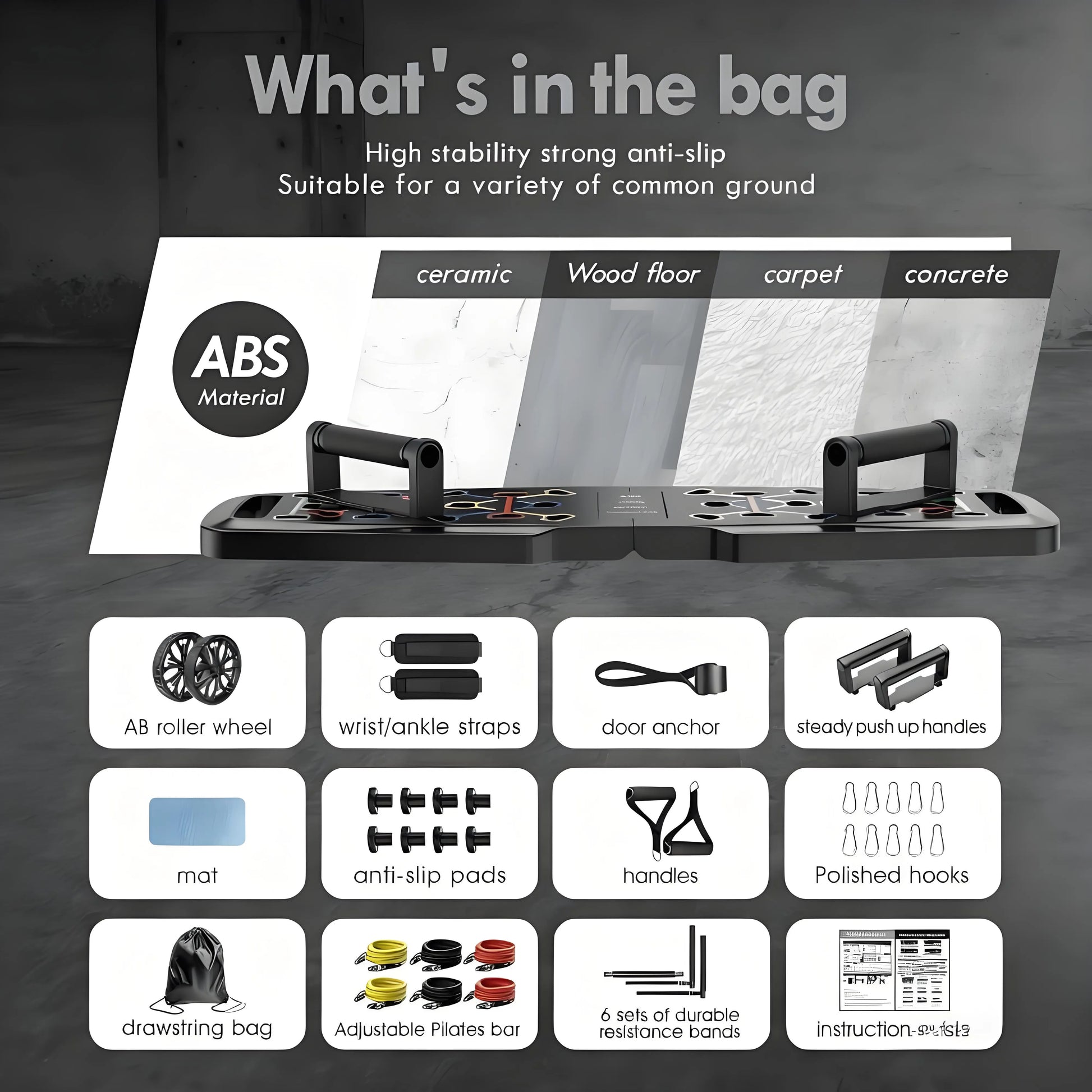 It balances professionalism and versatility. On the basis of retaining the core of professional push-up training, it adds a foldable fitness bar, wrist and ankle straps, an ab roller wheel, and multi-specification resistance bands, deriving hundreds of training movements. The equipment is lightweight but stable and durable. Whether you are a fitness novice, an advanced enthusiast, or family members of different age groups, you can choose the appropriate resistance intensity and training method according to your own ability to achieve safe and efficient fitness results.